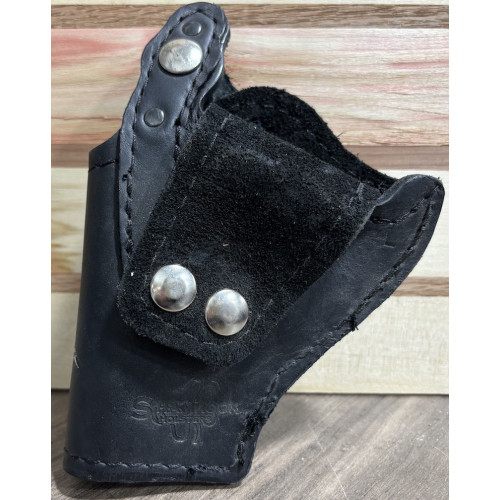 This holster was designed to fit the Ruger Alaskan and is composed of genuine USA cattle leather. With a durable leather exterior and a soft suede interior, our holsters will protect your gun from all elements of the weather and general wear. An interior steel reinforced thumb break and an adjustable thumb strap will help secure your handgun. The wide belt loop features two heavy duty directional safety snaps for added security.